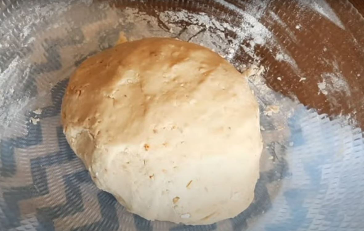 μέσα στο μείγμα αλευριού και ξεκινάμε να ζυμώνουμε με το χερι να ενσωματωθει καλά .