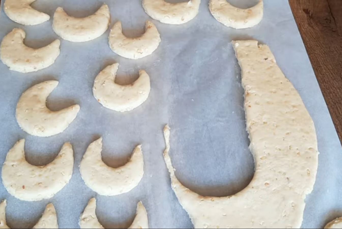 Ανοίγουμε την ζύμη με ένα πλάστη σε οβάλ σχήμα και με ένα ποτήρι κόβουμε τα μισοφέγγαρα και τα τοποθετούμε σε ένα ταψί στρωμένο με λαδόκολλα.