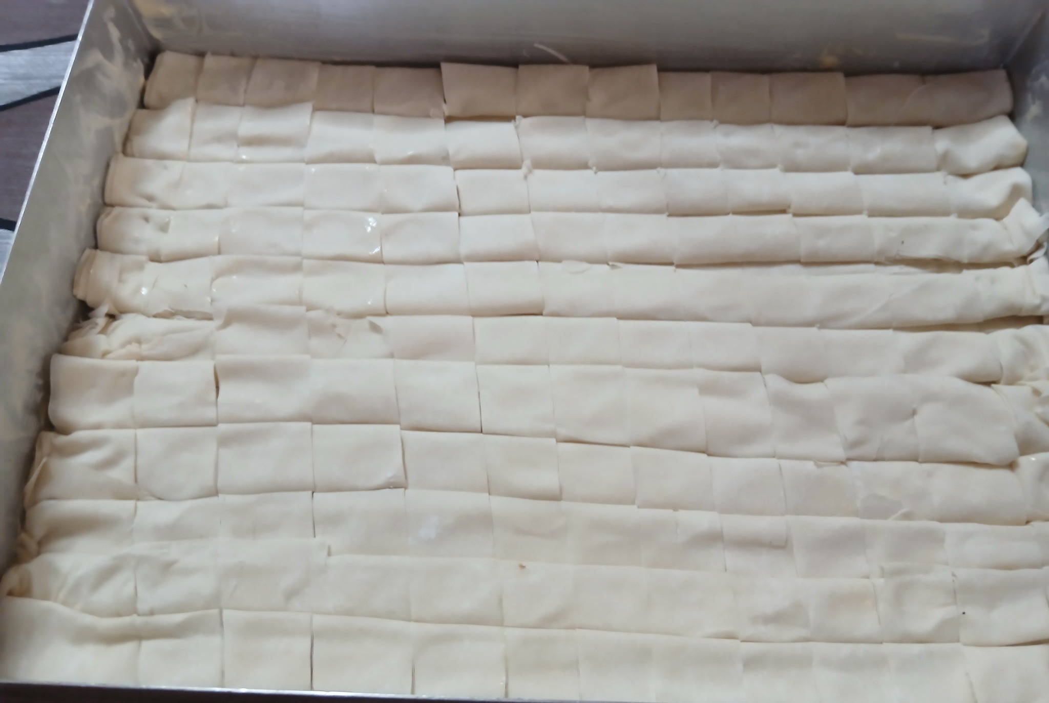 - Επαναλαμβάνουμε την ίδια διαδικασία με το δεύτερο μακρόστενο κομμάτι φύλλου κρούστας.