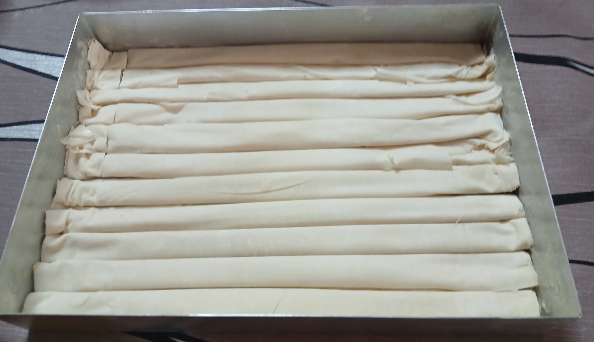 - Τυλίγουμε το διπλωμένο φύλλο σε ρολό κατά μήκος, όχι πολύ σφιχτά και το βαζουμε στο ταψί μας