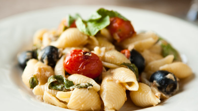 Προσθέτουμε τη σάλτσα ντομάτας, την κάππαρη, τις ελιές και το νερό. Αλατίζουμε και σιγομαγειρεύουμε για 5 λεπτά περίπου. Προσθέτουμε τον τόνο και την ντομάτα και ανακατεύουμε καλά. Προσθέτουμε τα βρασμένα κοχύλια και μαγειρεύουμε, ανακατεύοντας, για 2 λεπτά. Θα πρέπει να υπάρχουν ακόμη υγρά στην κατσαρόλα, αλλά όχι πολλά, θέλουμε να είναι σχετικώς «δεμένα». Βγάζουμε την κατσαρόλα από τη φωτιά, προσθέτουμε τον μαϊντανό και το φρέσκο κρεμμύδι, ανακατεύουμε καλά και δοκιμάζουμε για αλάτι. Σερβίρουμε.