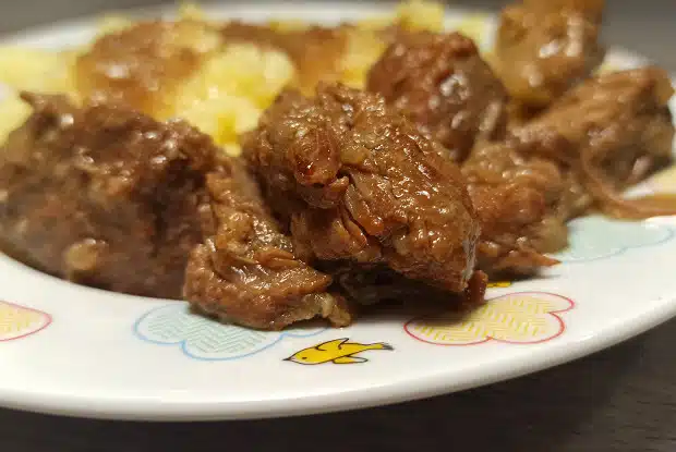 Προς το τέλος του μαγειρέματος ελέγχουμε την πυκνότητα της σάλτσας. Αν θέλουμε περισσότερη σάλτσα μπορούμε να προσθέσουμε επιπλέον 50-100 ml ζεστό νερό. Το κρέας είναι έτοιμο όταν έχει απορροφήσει τα περισσότερα υγρά και έχει μείνει με μια πλούσια βουτυράτη σάλτσα.