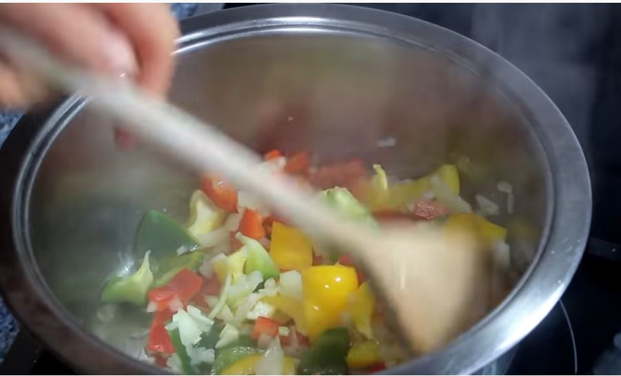 Ψιλοκόβουμε το κρεμμύδι και το σκόρδο, κόβουμε κυβάκια τις πιπεριές και τα ρίχνουμε όλα αυτά μαζί στην κατσαρόλα να σοταριστούν.