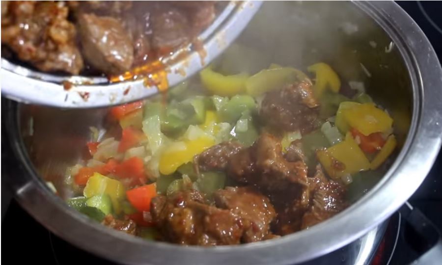 Ρίχνουμε το κρέας μας στην κατσαρόλα που έχουμε τις πιπεριές και ανακατεύουμε καλά.