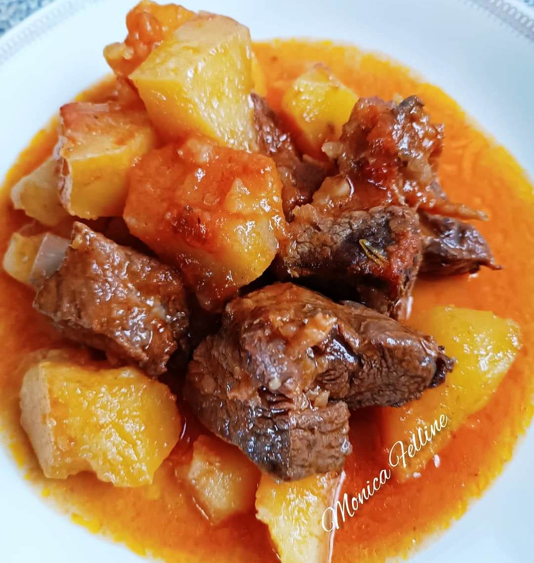Όταν έχει μειωθεί το νερό και έχει σχεδόν βρασει το κρεας με τη σάλτσα, προσθέτουμε τις πατάτες.