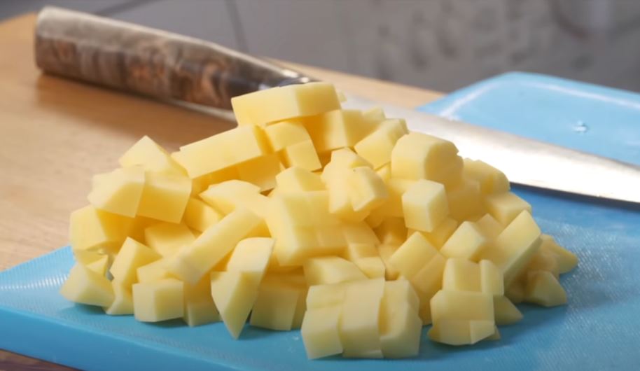 Κόψτε το κρεμμύδι σε μικρούς κύβους, και τις πατάτες σε κυβους.