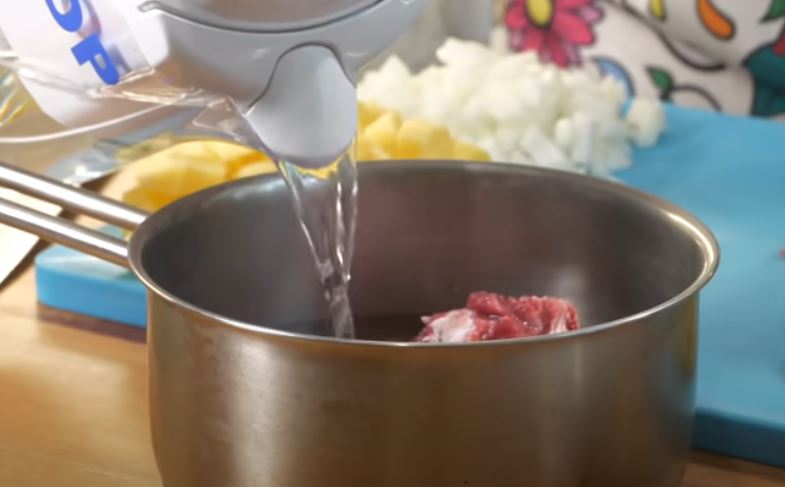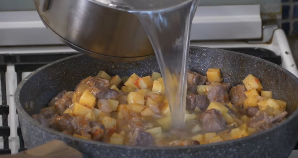 Προσθεστε μερικούς δακτυλίους καυτερή πιπεριά και ζωμό από το βραστό κόκαλο. Προσθέστε το ζωμό έτσι ώστε να καλύπτει μόλις το περιεχόμενο της κατσαρόλας, ανακατέψτε και καλύψτε με ένα καπάκι. Σιγοβράζουμε μέχρι να ψηθεί το κρέας.