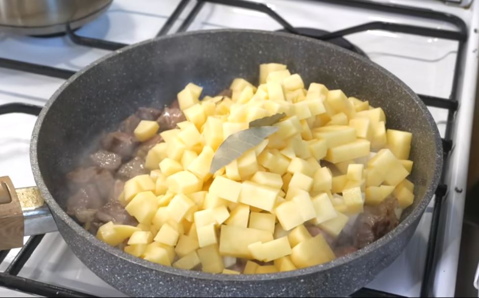 Κόψτε το κρέας σε μικρούς κύβους και βάλτε σε ένα βαθύ τηγάνι με την προσθήκη μικρής ποσότητας φυτικού λαδιού. Δεν ενοχλούμε το κρέας για αρκετά λεπτά, πρέπει να σοταριστεί.