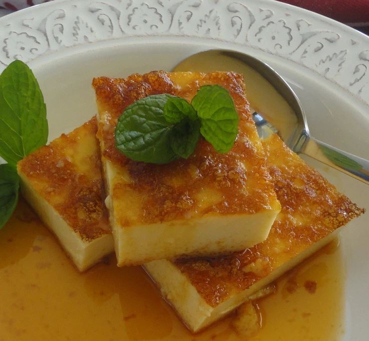 Μόλις η καραμέλα είναι έτοιμη, ρίχνουμε γρήγορα την καραμέλα σε ένα στρογγυλό πυρέξ (διαμέτρου 26 εκ.) και γυρίζουμε το πυρέξ στρογγυλό έτσι ώστε η καραμέλα να καλύψει τον πάτο και κάποια άκρη του πυρέξ. Αφήνουμε στην άκρη να κρυώσει. Όσο κρυώνει η καραμέλα θα αρχίσει να δημιουργεί ρωγμές, όταν εμφανιστούν σκασίματα παντού, τότε είναι ώρα να συνεχίσουμε με την κρέμα.