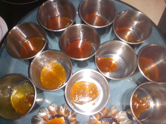 Σε μεταλλικό μπολ λιώνουμε 6 κ.σ. στέβια σε μέτρια φωτιά. Προσθέτουμε χυμό λεμονιού σε αυτό. Προσοχή, γιατί η στέβια σκουραίνει γρήγορα. Όσο είναι ακόμα ζεστό, μοιράζουμε την ψεύτικη καραμέλα στα μπολ. Προσοχή, η καραμέλα είναι πολύ ζεστή!