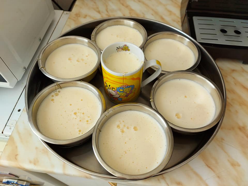 Χτυπάμε τα αυγά, τη στέβια, τη βανίλια και την τριμμένη καρύδας μέχρι να ασπρίσουν. Προσθέτουμε σταδιακά το γάλα. Ρίχνουμε την κρέμα ομοιόμορφα στα μπολ. Αραδιάζουμε τα μπολ σε ένα δίσκο στον οποίο έχουμε ρίξει 2 δάχτυλα νερό.