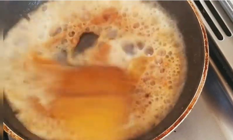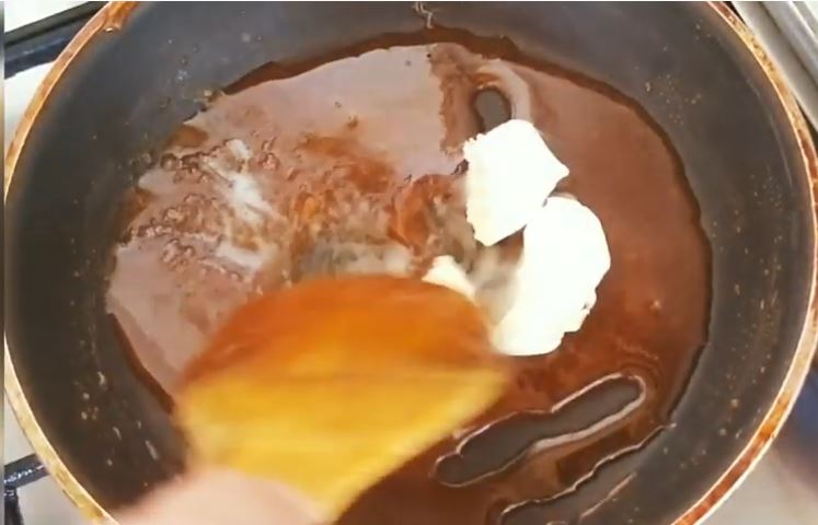 Μόλις η ζάχαρη είναι ρευστή προσθέτουμε 1 κσ βούτυρο, και ανακατεύουμε να λιώσει