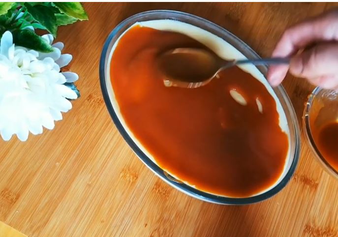 Απλώνουμε πάνω απο την κρέμα την καραμέλα και καλύπτουμε την κρέμα.