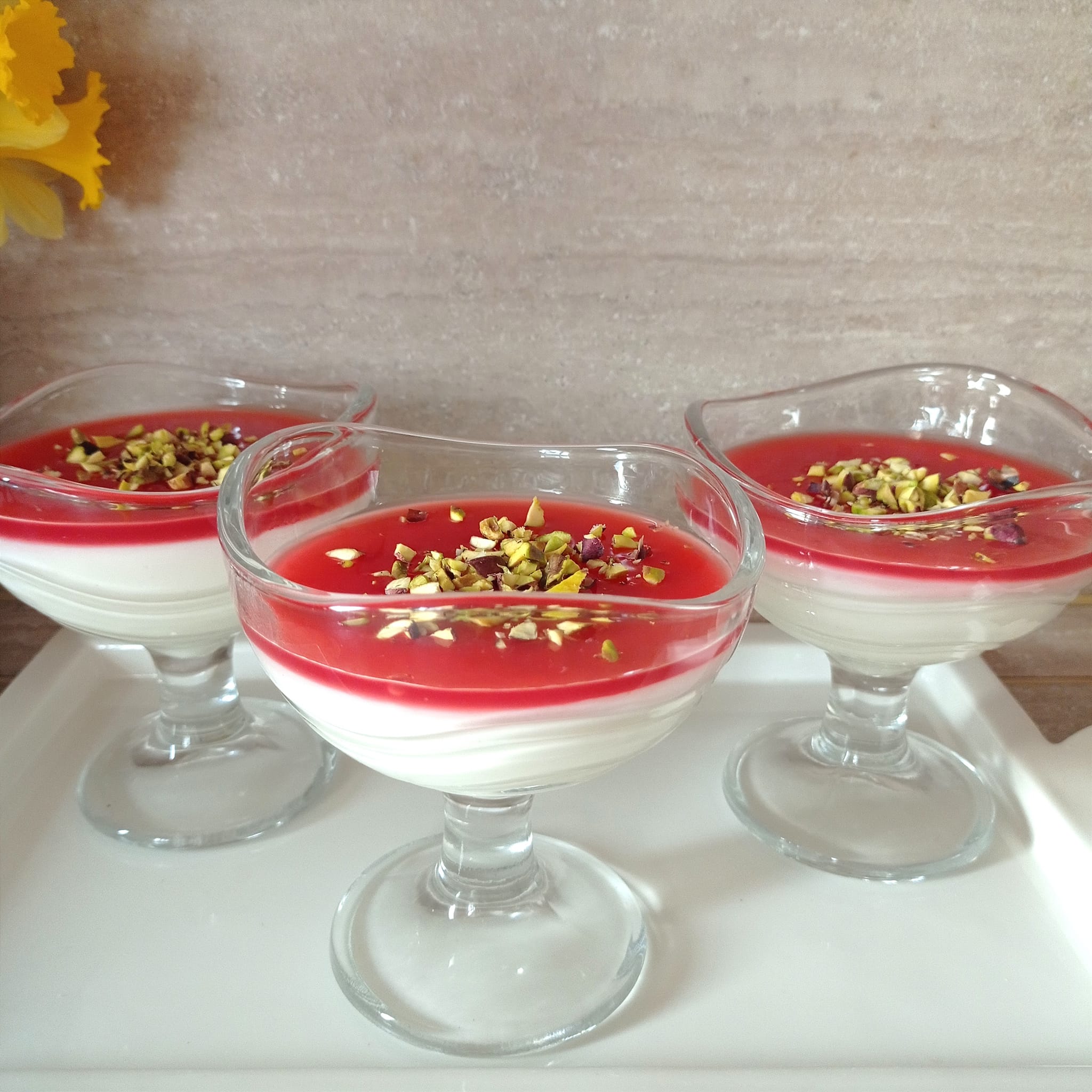 Μπορεί να γίνει και σε μικρότερα δοχεία, τα οποία αφού κρυώσουν τα γυρίζουμε σε πιατάκι και ρίχνουμε το ζελέ. Το γλυκό είναι πολύ ελαφρύ και μυρωδάτο 🥰