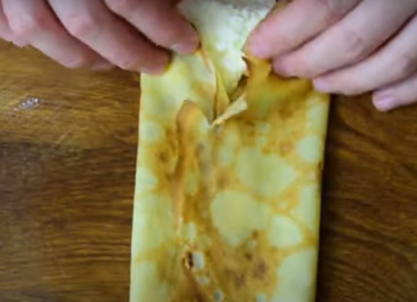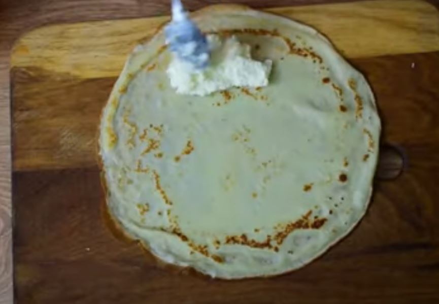 7 Βάλτε 1/2 κουταλάκι του γλυκού τυρί σε κάθε κρέπα και τυλιγετε.