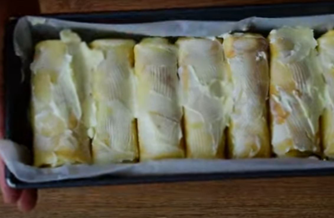 8 Αλείφουμε κάθε κρέπα με μαλακό βούτυρο τις βάζουμε σε μια φόρμα κέικ στρωμένο και χαρτι ψησίματος.
