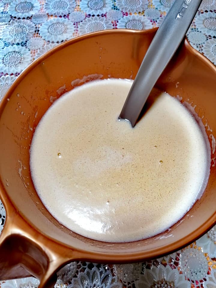 Σιγά σιγά, προσθέστε το αλεύρι, χτυπώντας συνεχώς με ένα σύρμα, μέχρι να γίνει ένας χυλός ομοιόμορφος και όχι πολύ πηχτός.