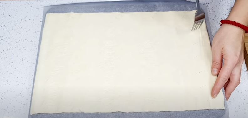 Βαζουμε το πρώτο φύλλο σφολιάτας σε ένα ταψι στρωμένο με χαρτί ψησίματος και το τρυπάμε παντού με ενα πιρούνι (αυτό το φύλλο θα είναι και η βάση του γλυκού).