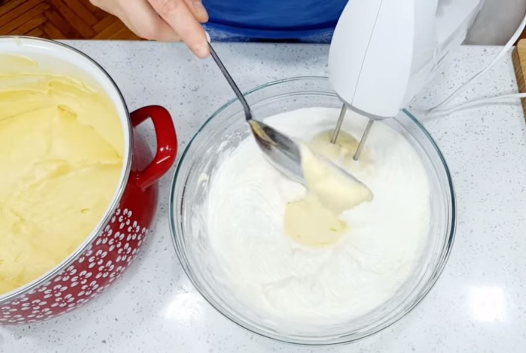 Ρίχνουμε μέσα στην μαρέγκα κουταλιά κουταλιά την κρέμα