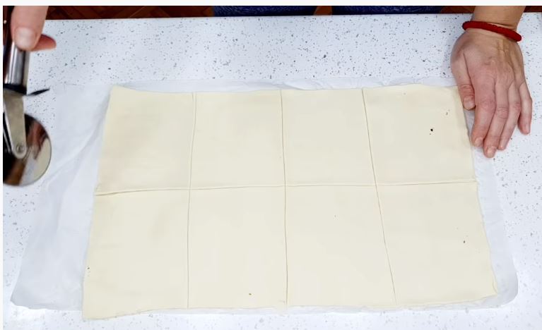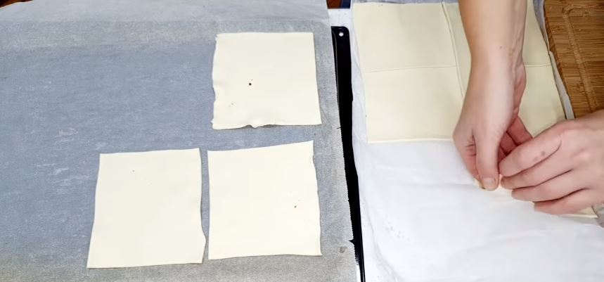 Ανοίγουμε το δεύτερο φύλλο και το κόβουμε με ένα μαχαίρι ή την ρόδα κοπής πίτσας σε τετράγωνα.