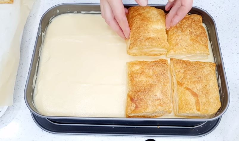 Αδειάζουμε και στρώνουμε την κρέμα πάνω απο την σφολιάτα και απο απο πάνω καλύπτουμε με τα σφολιατίνια.