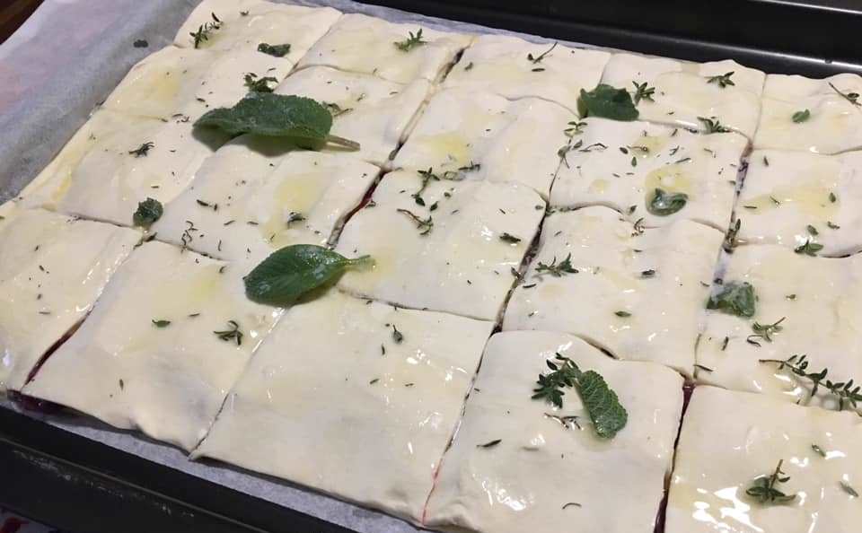 Αλείφουμε τα τετράγωνα με το λιωμένο βούτυρο και τέλος τα πασπαλίζουμε με ξεφλουδισμένο θυμάρι και λίγα φύλλα φασκόμηλου.