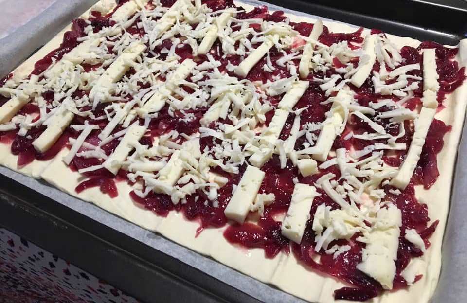 Ανοιγουμε 1 ρολό σφολιάτας στο ταψί αφήνοντάς το κατευθείαν στο χαρτί ψησίματος. Μοιράζουμε το μείγμα του κρεμμυδιού πάνω στη ζύμη.
