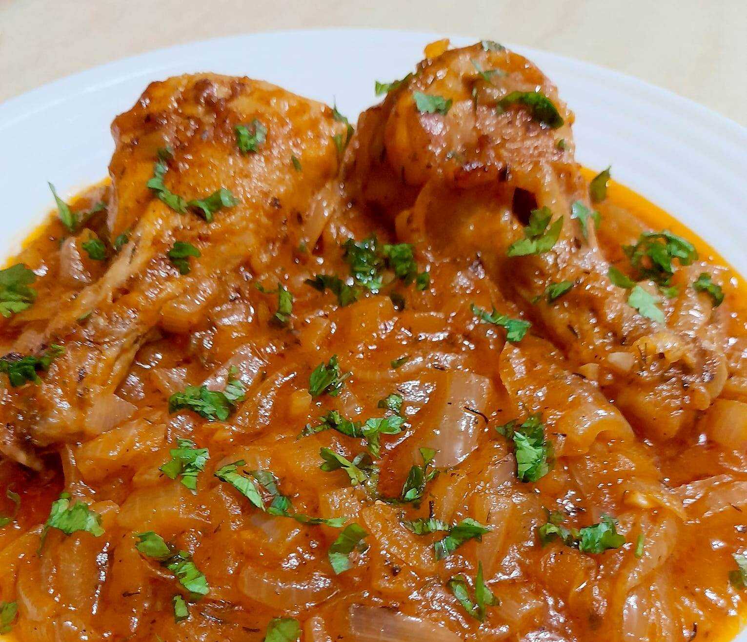 Αφού «σφράγισαν» τα μπουτακια και από τις δύο πλευρές, τα έβγαλα σε πιατέλα. Προσθέτουμε την άλλη κουταλιά λάδι και το κρεμμύδι στη κατσαρόλα και αλατίζουμε. Μαγείρεψα μέχρι να μαλακώσει εντελώς, μετά πρόσθεσα μαύρο πιπέρι, πελτέ ντομάτας, πάπρικα, λιαστή ντομάτα και πιπεριές ψιλοκομμένες. Ανακάτεψα και πρόσθεσα τα μπουτάκια κοτόπουλου.