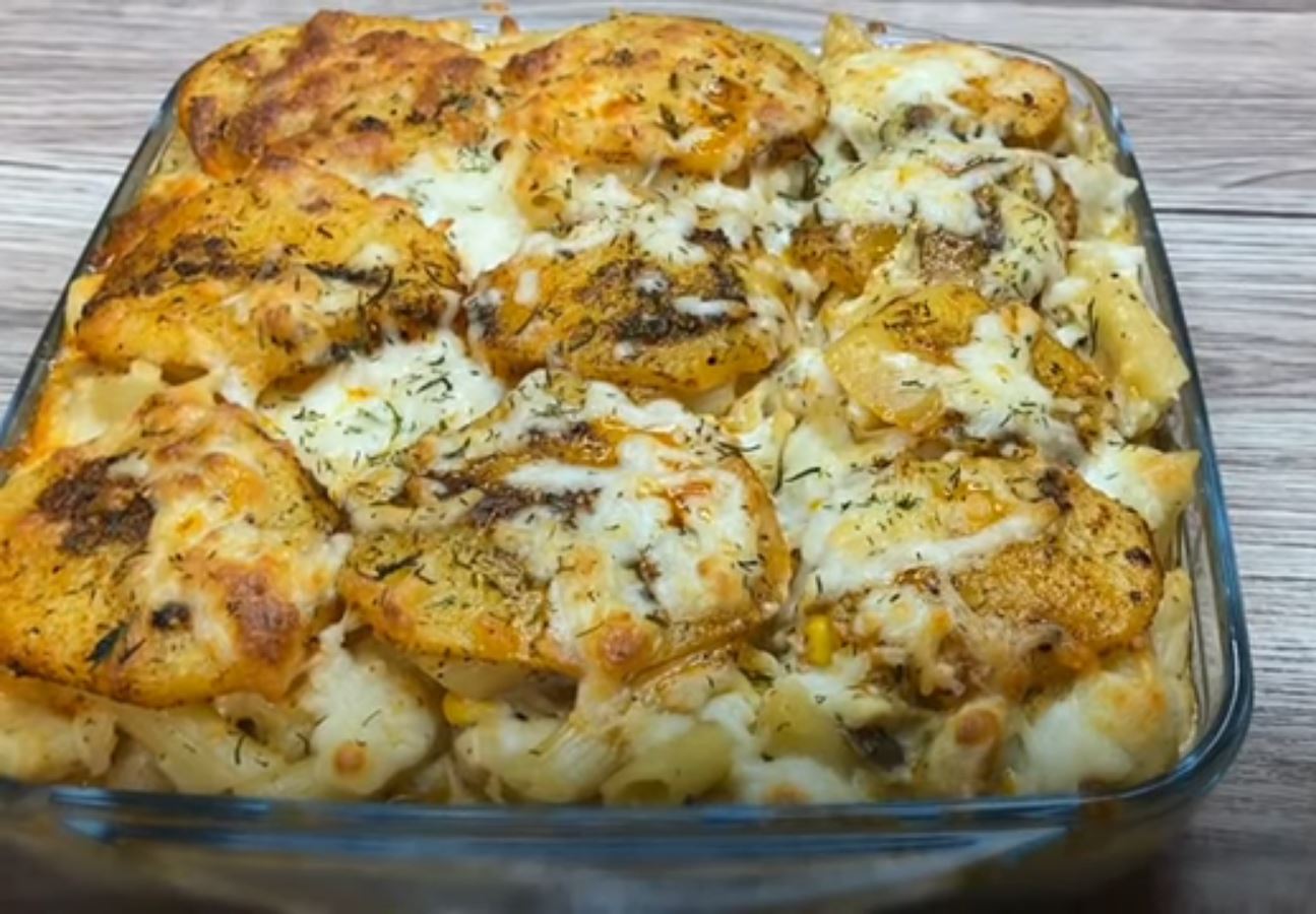 Σε ένα πυρέξ αδειαστε τα ζυμαρικά με την σάλτσα απλώστε από πάνω τις πατάτες και πασπαλίστε με μοτσαρελα και μαιντανο