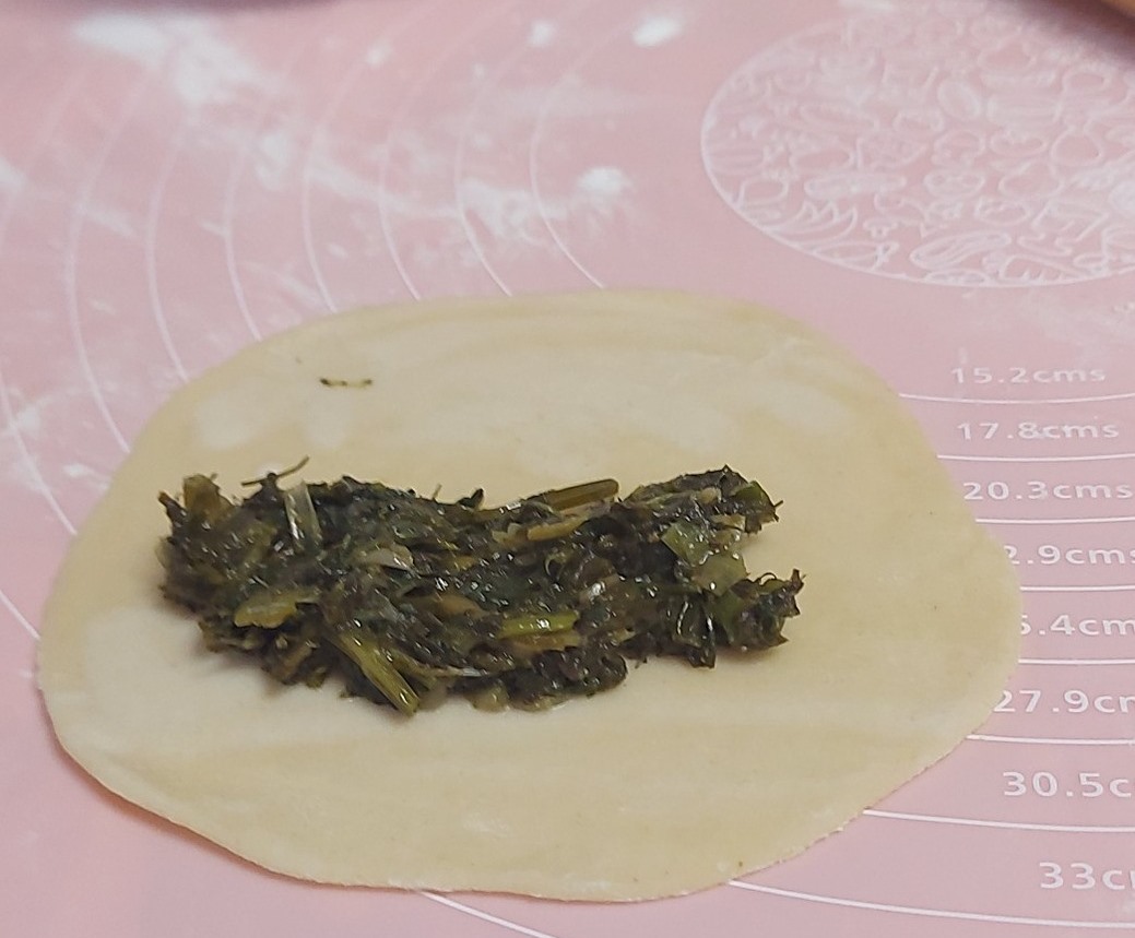 Μετά τον χρόνο αναμονής, παίρνω ένα κομμάτι ζύμης και το ανοίγω με πλάστη (νεσεσσέ) σε λεπτό φύλλο πάνω σε επιφάνεια πασπαλισμένη με λίγο αλεύρι. Χρησιμοποιώ ένα στρογγυλό κουπ-πατ ή ένα ποτήρι για να κόψω στρογγυλά πιτάκια. Τοποθετώ μια κουταλιά από τη γέμιση με σέσκουλα στο κέντρο κάθε κύκλου,