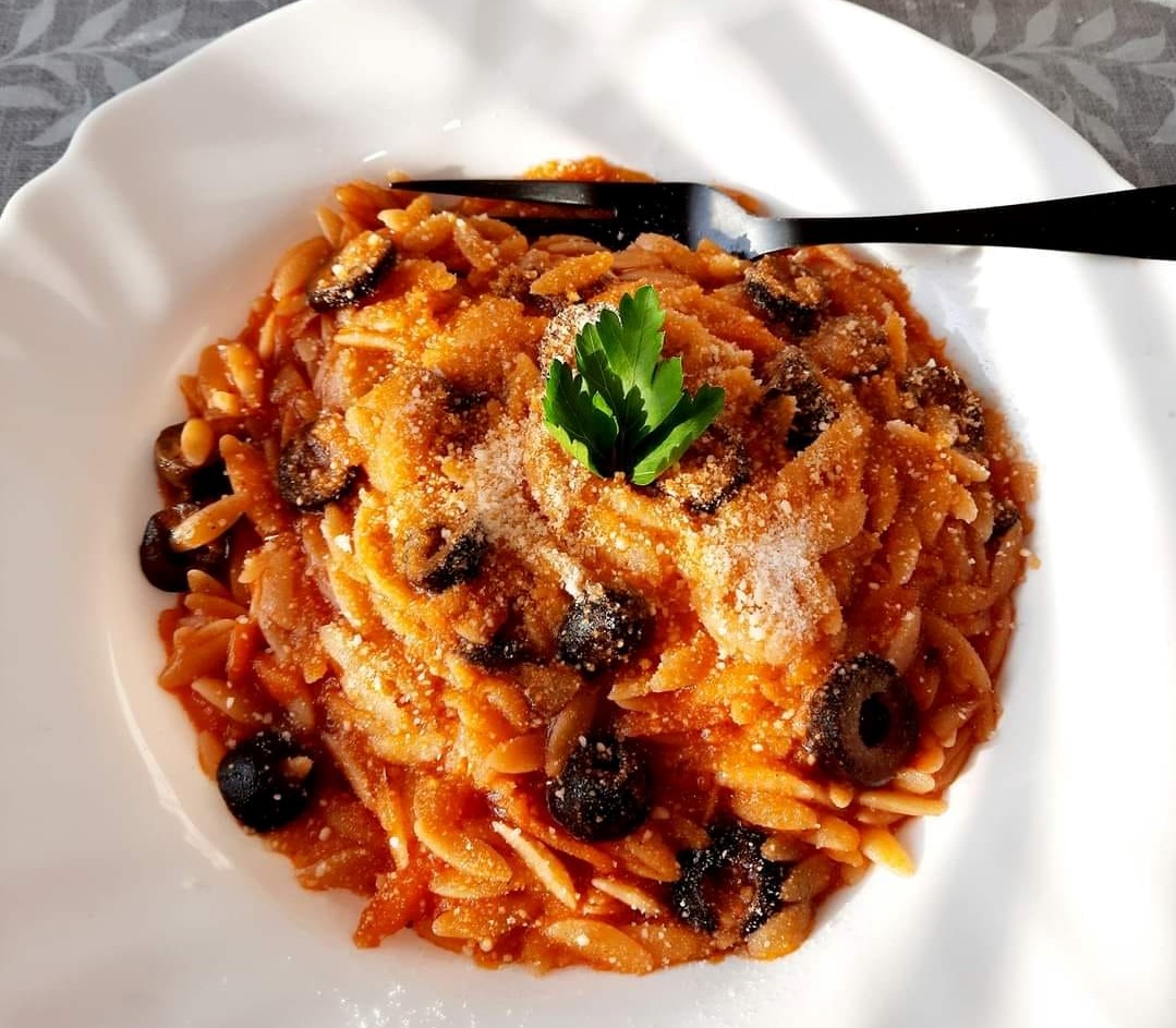 Κριθαράκι με ντομάτες, ελιές και παρμεζάνα
