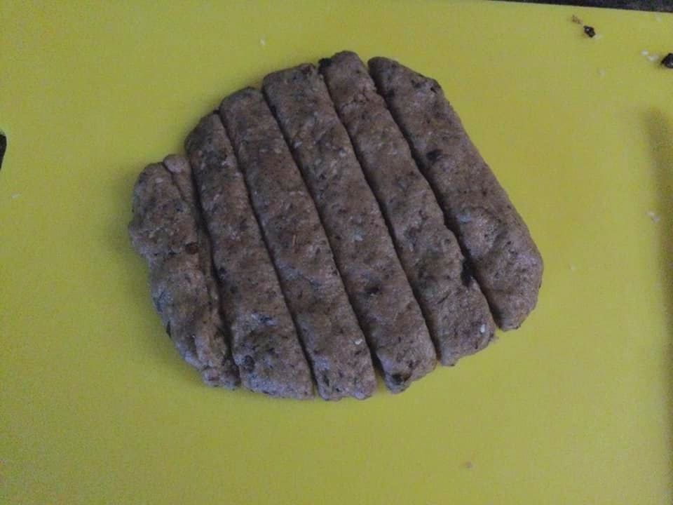 Ανακατεύουμε όλα τα υλικά και φτιάχνουμε τη ζύμη μας . Αφήνουμε να ξεκουραστεί 5-10 λεπτά και πλάθουμε κορδόνια κόβοντας κομμάτια ζύμης . Πιο εύκολο το βρήκα να παίρνω ζύμη , να ανοίγω χοντρή πιτούλα και να κόβω λωρίδες και μετά να πλάθω (φώτο) .