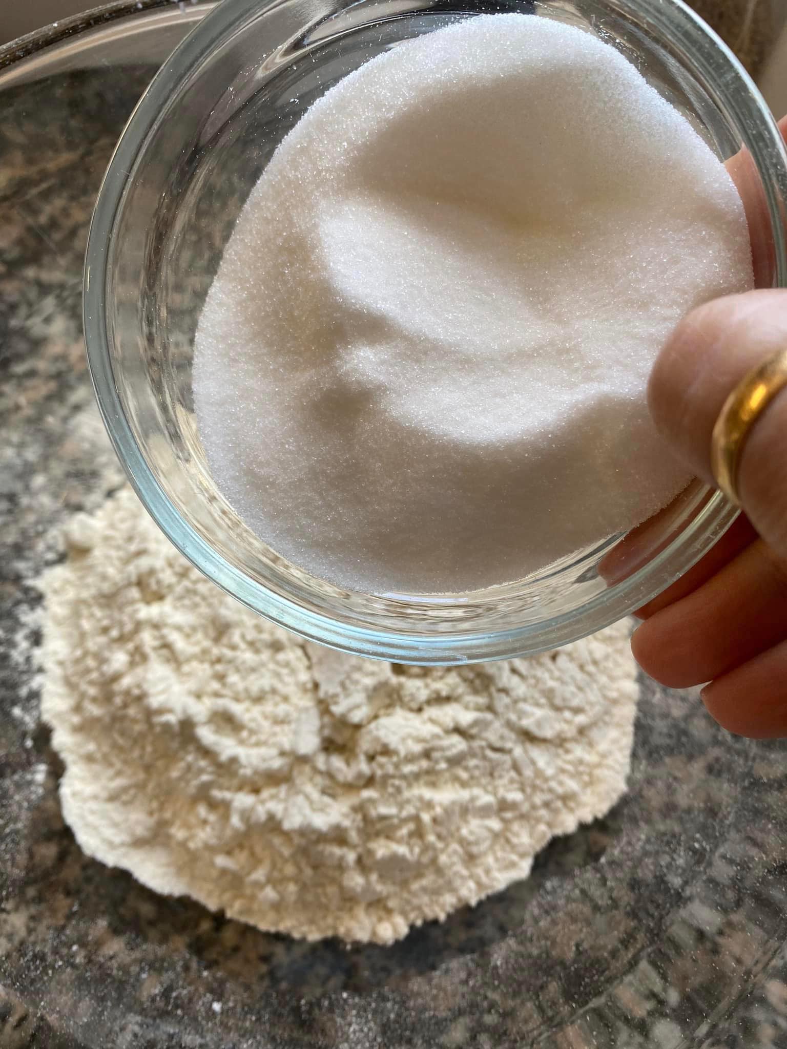 Σε ένα μεγάλο μπολ προσθέστε aλεύρι και την ζάχαρη