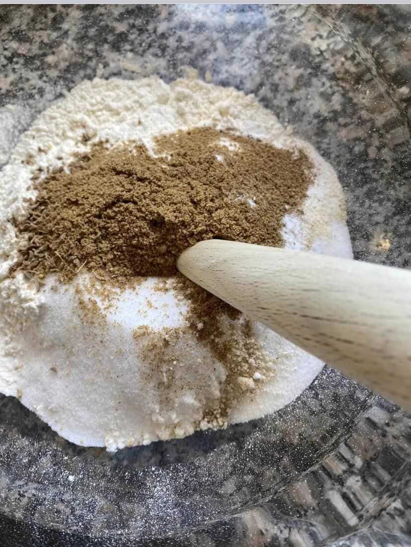 Σε αυτό το μπολ προσθέστε αλεσμένο γλυκάνισο ολόκληρους γλυκάνισους, μπέικιν πάουντερ, μαγειρική σόδα και το μαχλέμπι σκόνη. Ανακατέψτε όλα καλά με μια ξύλινη κουτάλα