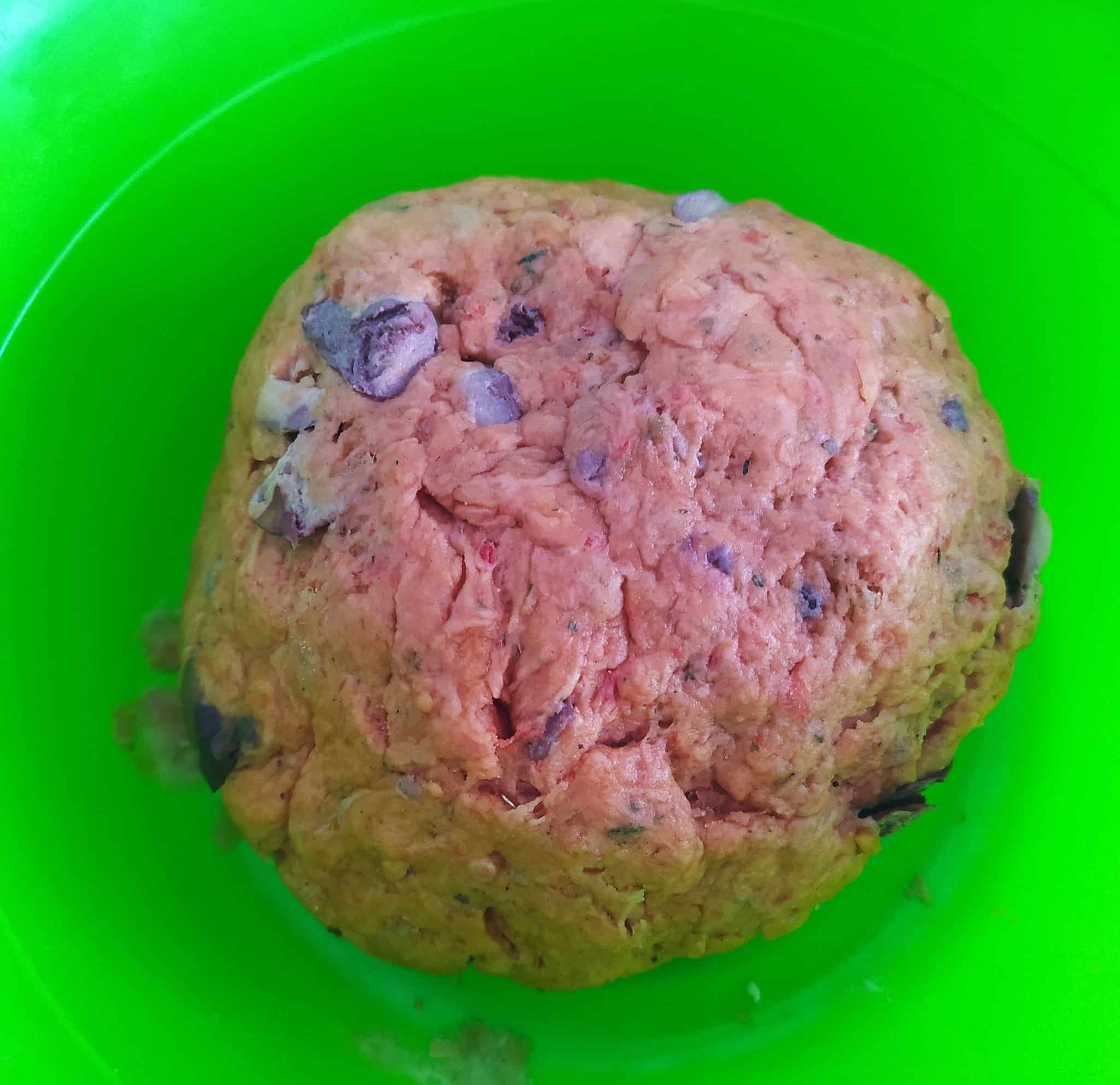 2.Προσθέτουμε το αλεύρι, τη ρίγανη,το πιπέρι και τις ελιές και ανακατεύουμε καλά τα υλικά με το χέρι μας μέχρι να ενωθούν και να δημιουργηθεί μία μαλακή ζύμη.