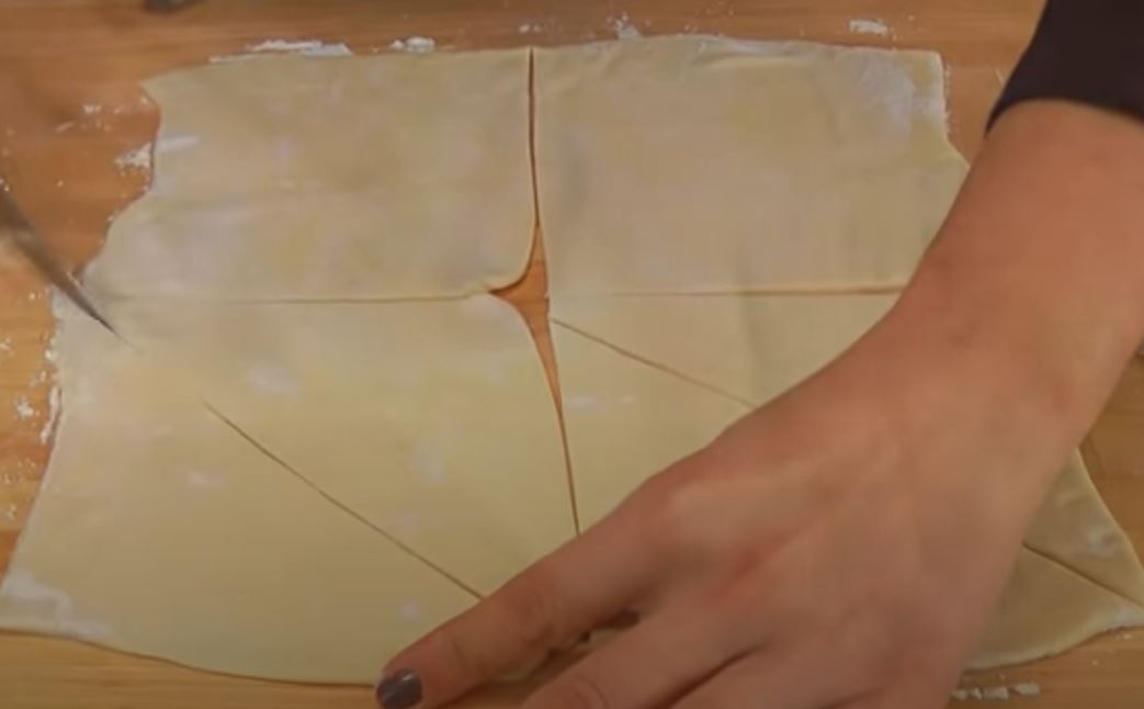 3) Κόψτε κάθε κομμάτι σφολιάτας σε 4 τετράγωνα και στη συνέχεια κόψτε κάθε τετράγωνο στη μέση σε μια διαγώνιο, από τη μία γωνία στην άλλη.