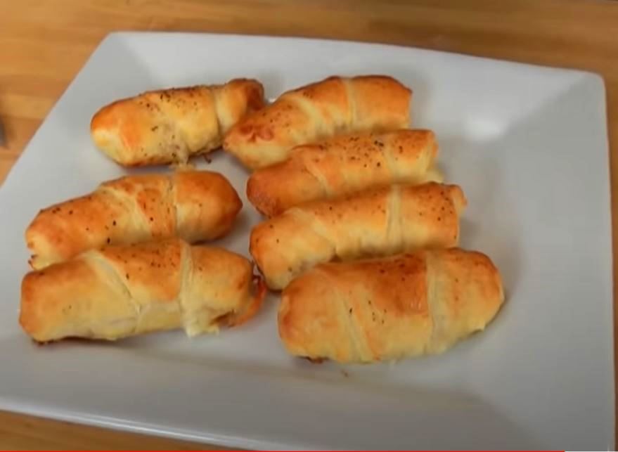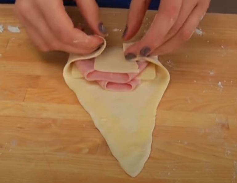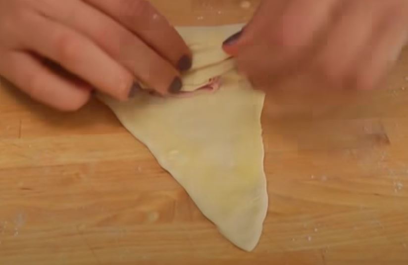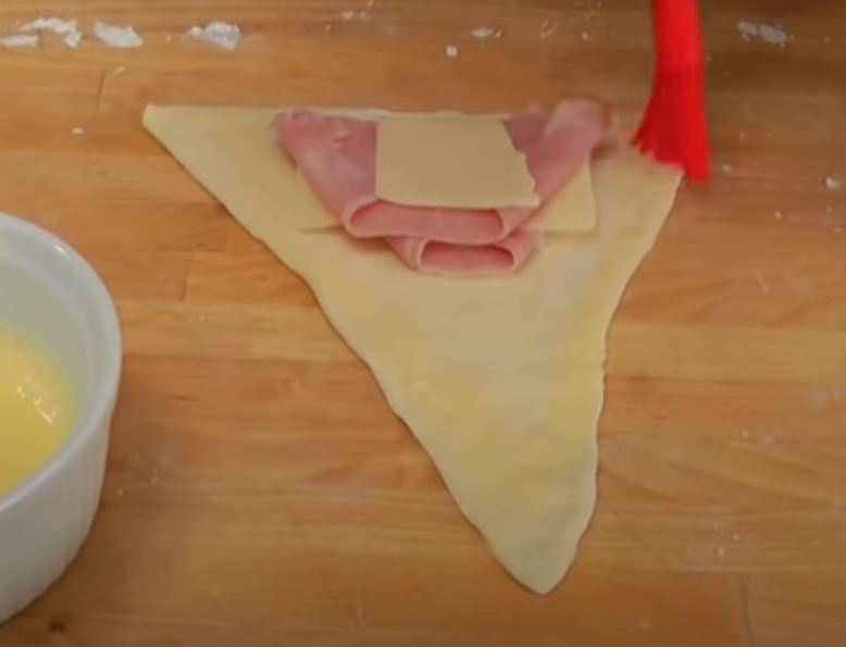 4) Τοποθετήστε ένα κομμάτι ζαμπόν στη μεγαλύτερη πλευρά του τριγώνου και τοποθετήστε το πάνω με ένα κομμάτι τυρί (κοψτε το τυρί και το ζαμπόν για να ταιριάζει καλά), βουρτσίστε όλες τις πλευρές με το αυγό και διπλώστε έτσι ώστε το λεπτότερο άκρο καταλήγει στην κορυφή.