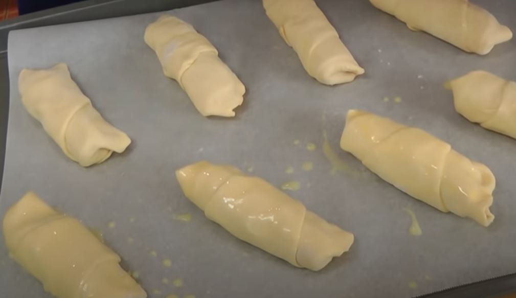 5) Τοποθετήστε τα με ραφή προς τα κάτω στο ταψί και βουρτσίστε από πάνω με λίγο αυγό.