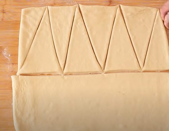 Ανοίγουμε τη ζύμη και την κόβουμε σε τρίγωνα με βάση 9 εκ. περίπου.