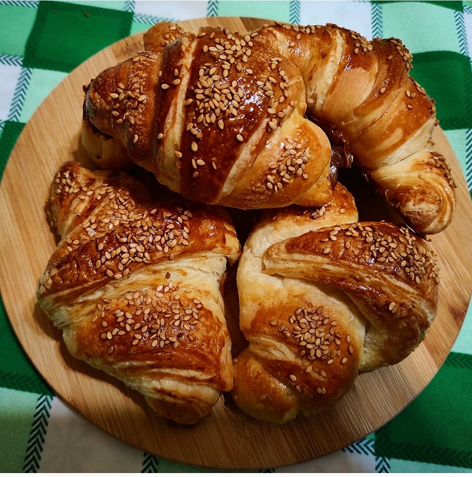 Τοποθετούμε τα κρουασάν στο ταψί που έχουμε καλύψει με λαδόκολλα, τα αλείφουμε με ασπράδι και τα καλύπτουμε με σουσάμι, ηλιόσπορο ή παπαρουνόσπορο.