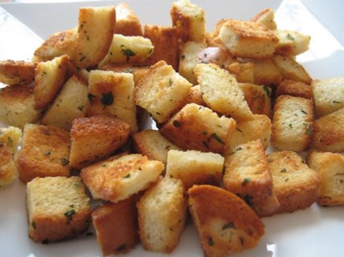 Βάλτε λίγο λάδι για να ζεσταθεί σε ένα βαθύ τηγάνι ή κατσαρόλα και προσθέστε κύβους ψωμιού. Ανακατεύουμε συνεχώς έτσι ώστε όλα τα κομμάτια του ψωμιού να τηγανιστούν λίγο. Προσέξτε να μην καούν. Στη συνέχεια, μεταφέρετε το ψωμί στο ένα μπολ σερβιρίσματος.
