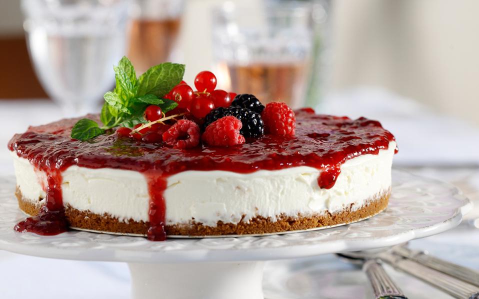 Κρέμα: Ρίχνουμε το τυρί και τη ζάχαρη σε ένα μπολ και τα ανακατεύουμε με μια κουτάλα. Προσθέτουμε την κρέμα γάλακτος και συνεχίζουμε το ανακάτεμα μέχρι να ενωθούν τα υλικά. Αδειάζουμε το μείγμα πάνω από το τριμμένο μπισκότο, ισιώνουμε την επιφάνεια με μια σπάτουλα, σκεπάζουμε με μεμβράνη και βάζουμε το γλυκό στο ψυγείο για 1 – 2 ώρες τουλάχιστον.