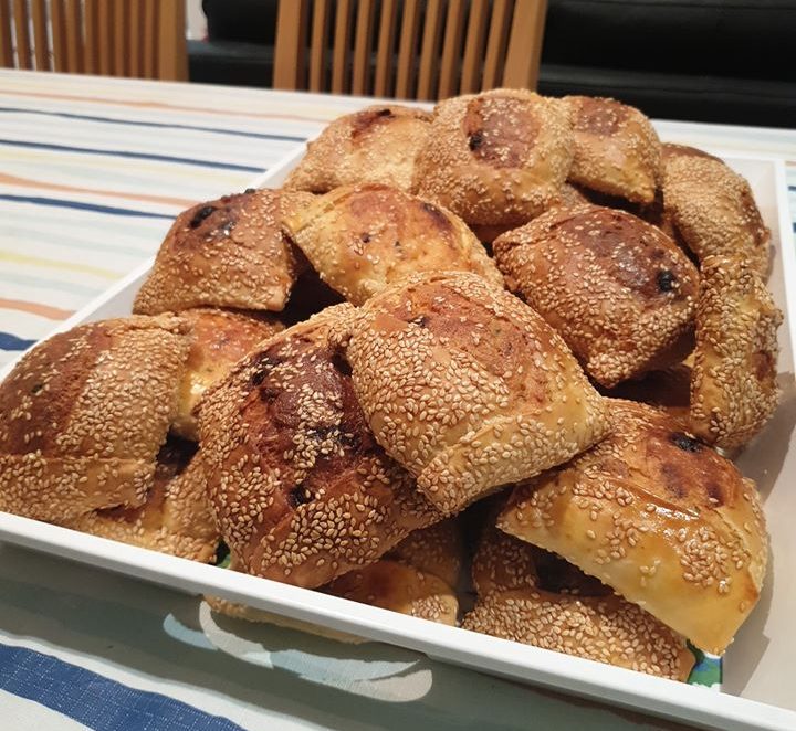 Προθερμάνετε το φούρνο στους 180 ° C. Στρώστε το ταψί με χαρτί ψησίματος. Πιέστε καλά τη μία πλευρά κάθε ζύμης πάνω στο σουσάμι που είναι στην πετσέτα για να καλύφθεί καλά. Τοποθετήστε 1 κουταλιά της σούπας γέμιση στο κέντρο και διπλώστε στις τρεις πλευρές για να δημιουργήσετε ένα στρογγυλεμένο σχήμα,αφήνοντας ένα κενό στο κέντρο με την γέμιση εκτεθειμένη.