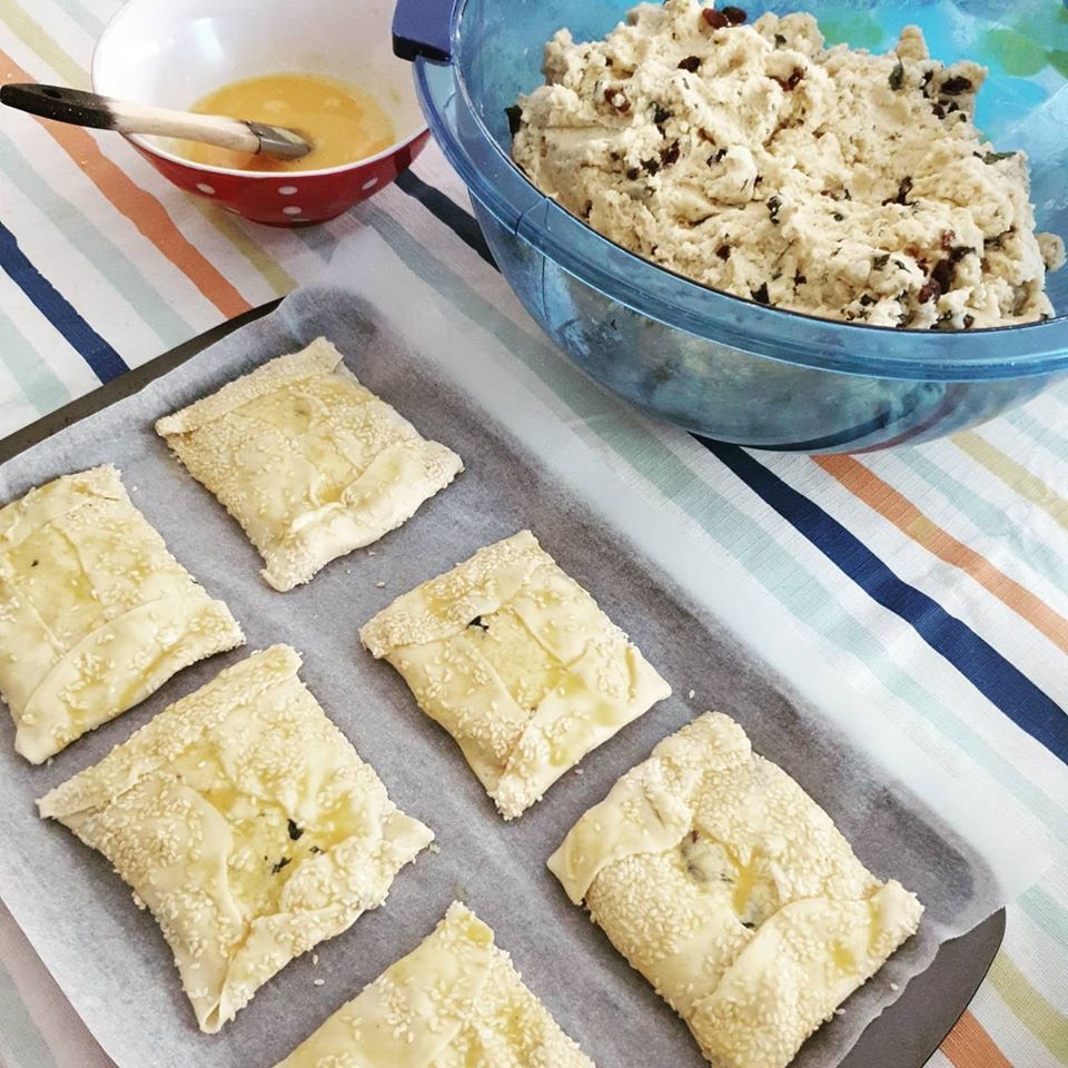 Για να κάνετε την γέμιση, συνδυάστε τα τυριά, το μείγμα μαγιάς, το σιμιγδάλι, το απλό αλεύρι και τα αυγά σε ένα μεγάλο μπολ. Σκεπάστε το και ψύξτε όλη τη νύχτα. Την επόμενη μέρα, ανακατεύουμε τo δυοσμο, το μπέικιν πάουντερ και τις σουλτανίνες μέχρι να συνδυαστούν καλά.