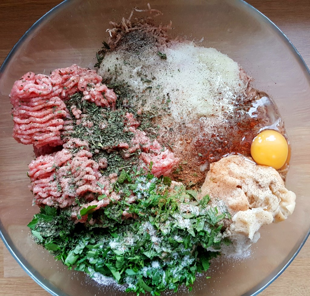 Βυθίστε το μπαγιάτικο ψωμί σε λίγο νερό για 10 λεπτά μέχρι να είναι μαλακό, στραγγίστε με τα χέρια σας πιέζοντας όλο το νερό και τριψτε το μέσα στο μείγμα του κιμά.