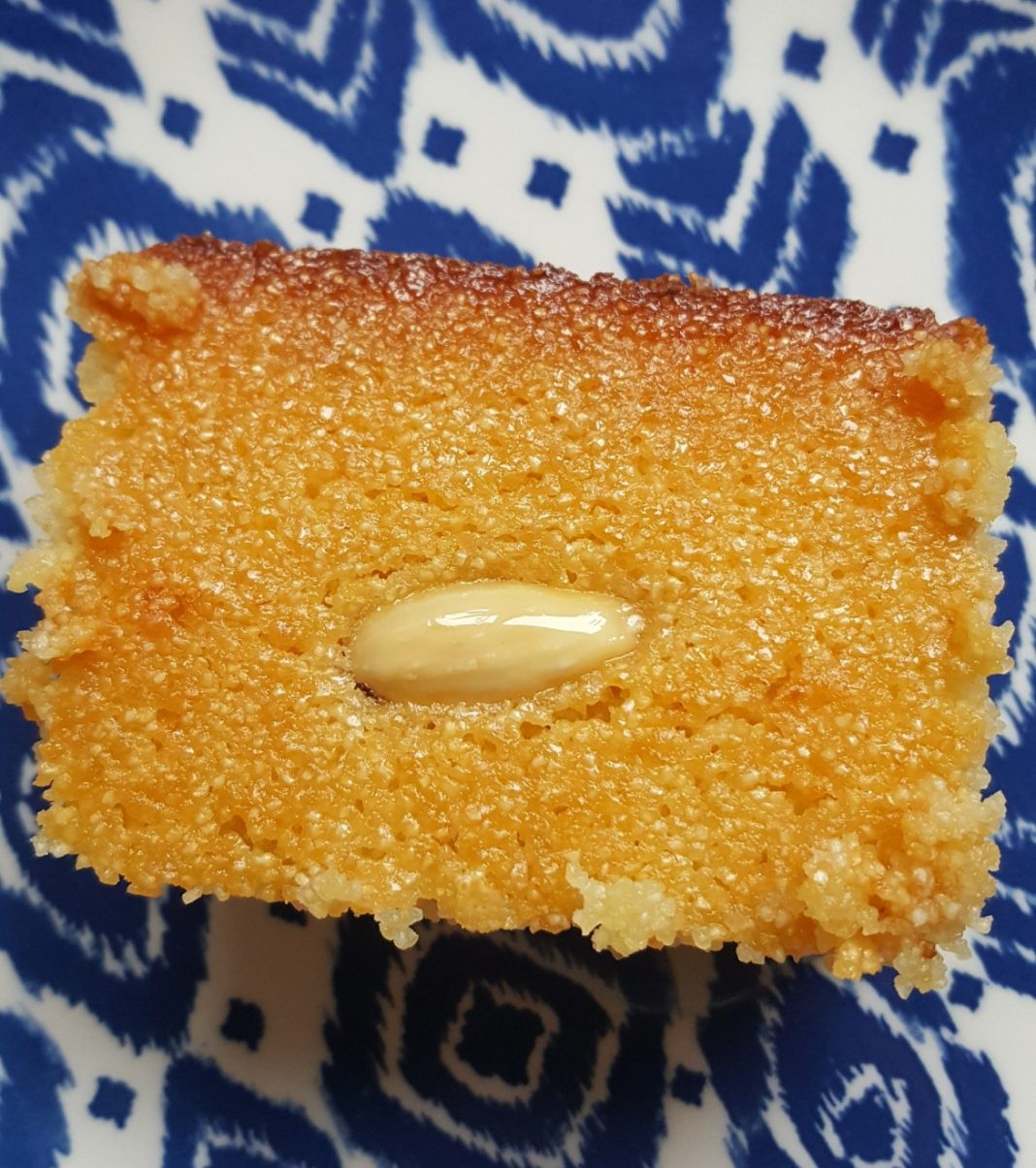Βήμα 3 Κάντε το κέικ: Σε ένα μπολ προσθέστε το σιμιγδάλι, τη ζάχαρη, το γιαούρτι, το λάδι, τα αυγά, το μπεικιν παουντερ και τη μαστίχα. Ανακατέψτε μαζί μέχρι να συνδυαστούν όλα τα συστατικά. Από πάνω τοποθετήστε τα αμύγδαλα ένα προς ένα δημιουργώντας γραμμές.