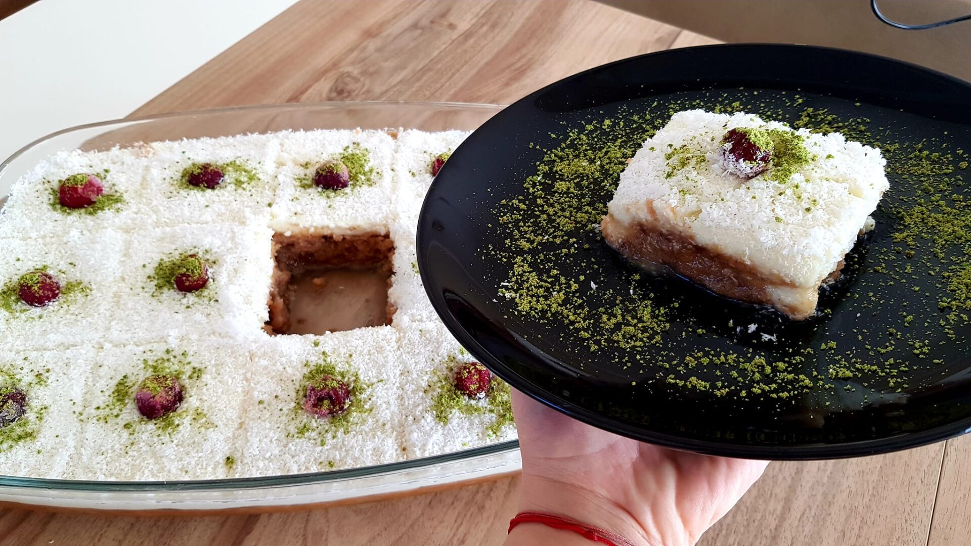 να πήξει. Αφού πήξει και κανει φουσκάλες ρίχνουμε το γκαρνι ανακατευουμε να γίνει κρέμα και αποσύρουμε από τη φωτιά και την απλώνουμε πάνω από το παντεσπάνι. Πασπαλίζουμε με την τριμμένη καρυδα και αφήνουμε για 4-5 ώρες να κρυωσει. Κοβουμε σε κυβάκια και διακοσμούμε με κερασάκια ζαχαρωμένα και τριμμένο φιστίκι αιγίνης
