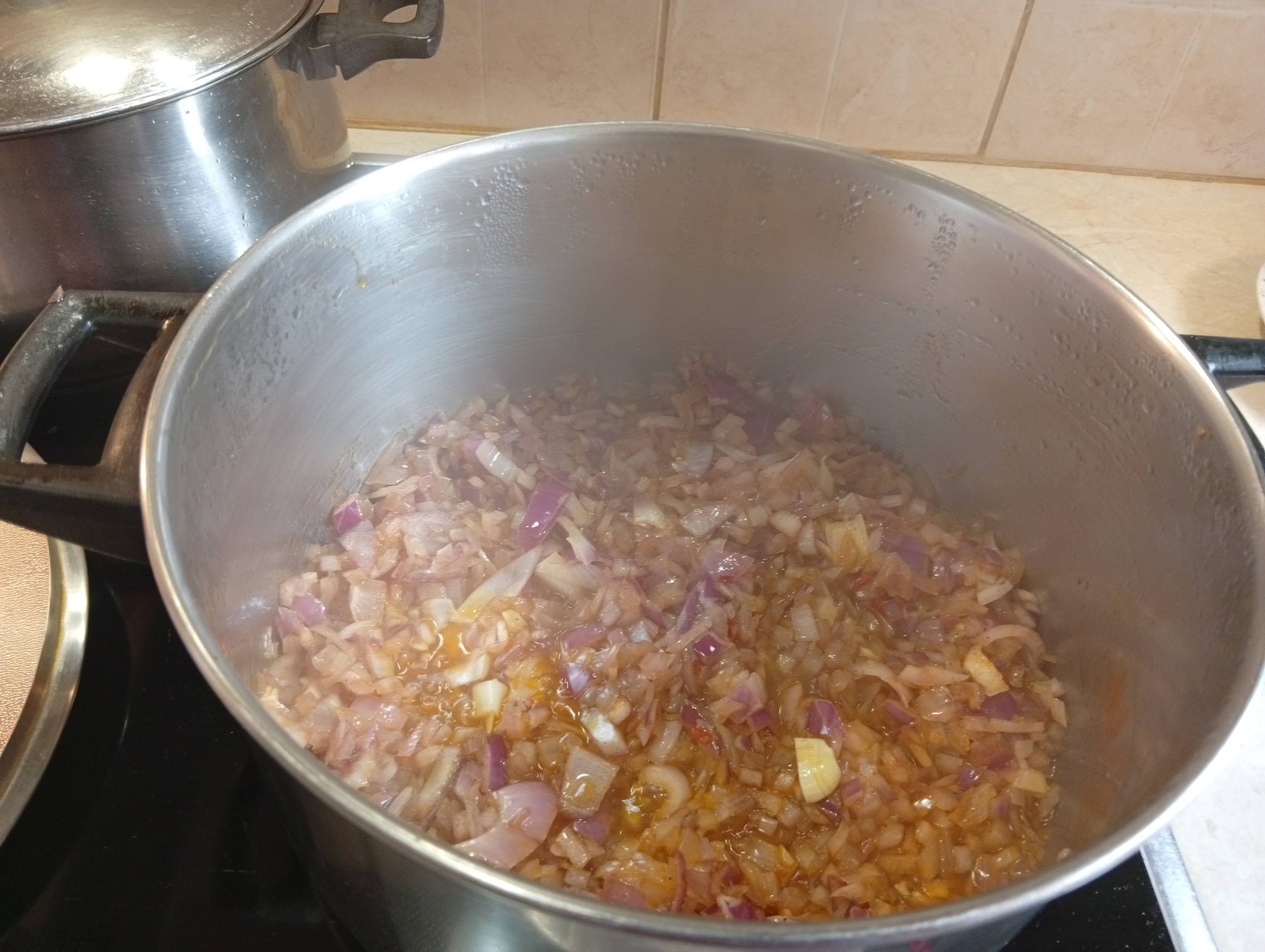 Σε μια μεγάλη κατσαρόλα βάζουμε το ελαιόλαδο και σοτάρουμε τα κρεμμύδια και το σκόρδο. Προσθέτουμε το αλάτι το μαύρο και το άσπρο πιπέρι.