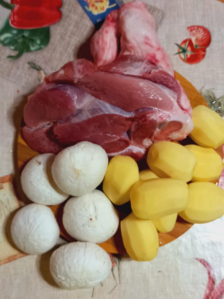 Καθαρίζουμε τις πατάτες και τις κόβουμε σε κομμάτια. Καθαρίζουμε τα κρεμμύδια και τα κόβουμε σε μεγάλα κομμάτια, όπως και τα μανιτάρια και το σκόρδο .