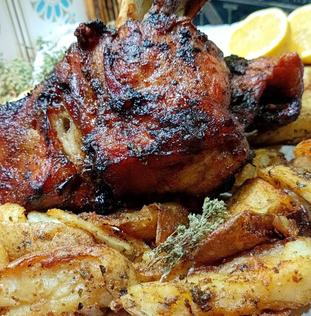 Για γαρνιτούρα, βράζουμε πατάτες με τη φλούδα, τις σπάμε σε ταψί, τις αλατοπιπερώνουμε, προσθέτουμε πάπρικα, ρίγανη, ζουμάκι από το κότσι και ψήνουμε να ροδίσουν.